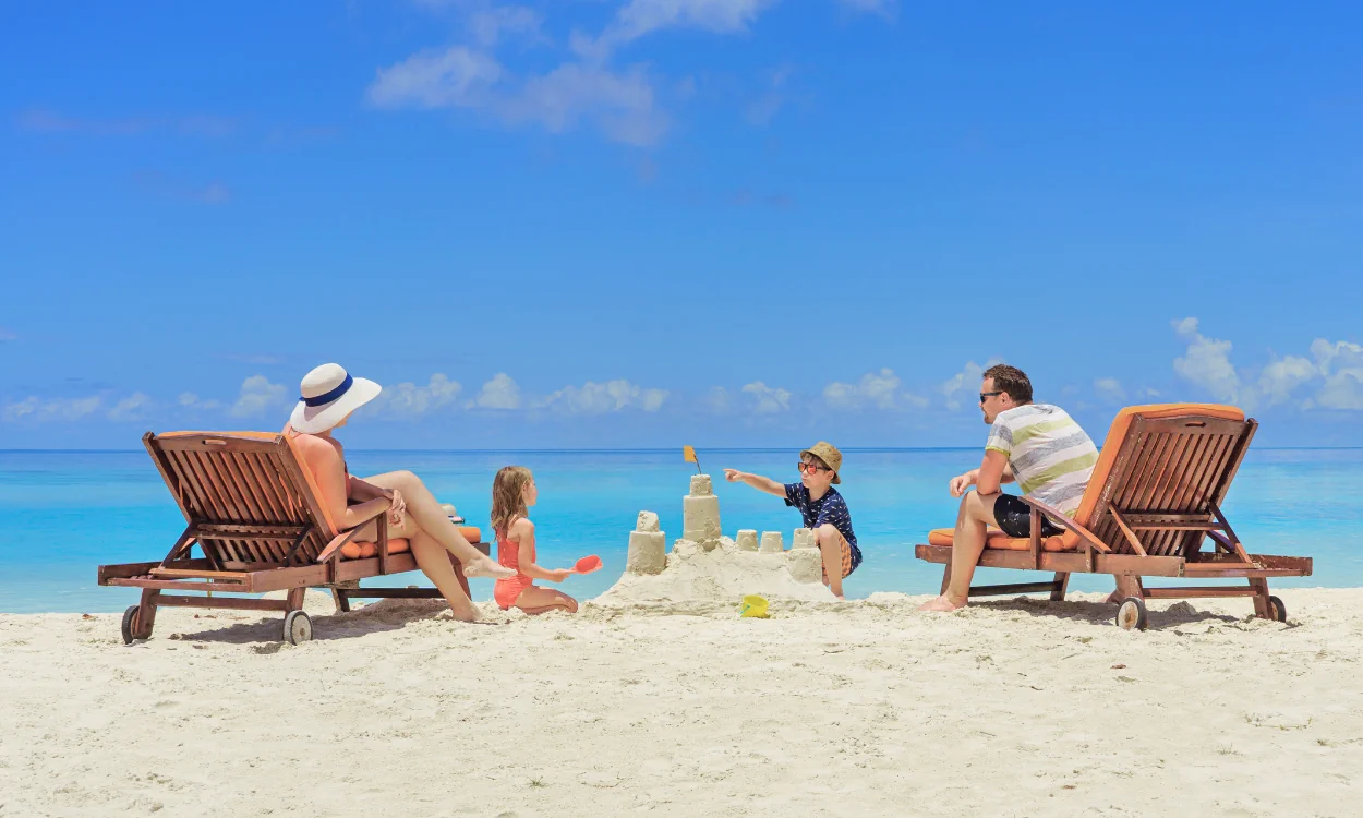 Hase am Strand mit Ostereiern und Text Chillen am Strand sowie Button Reisegutschein verschenken